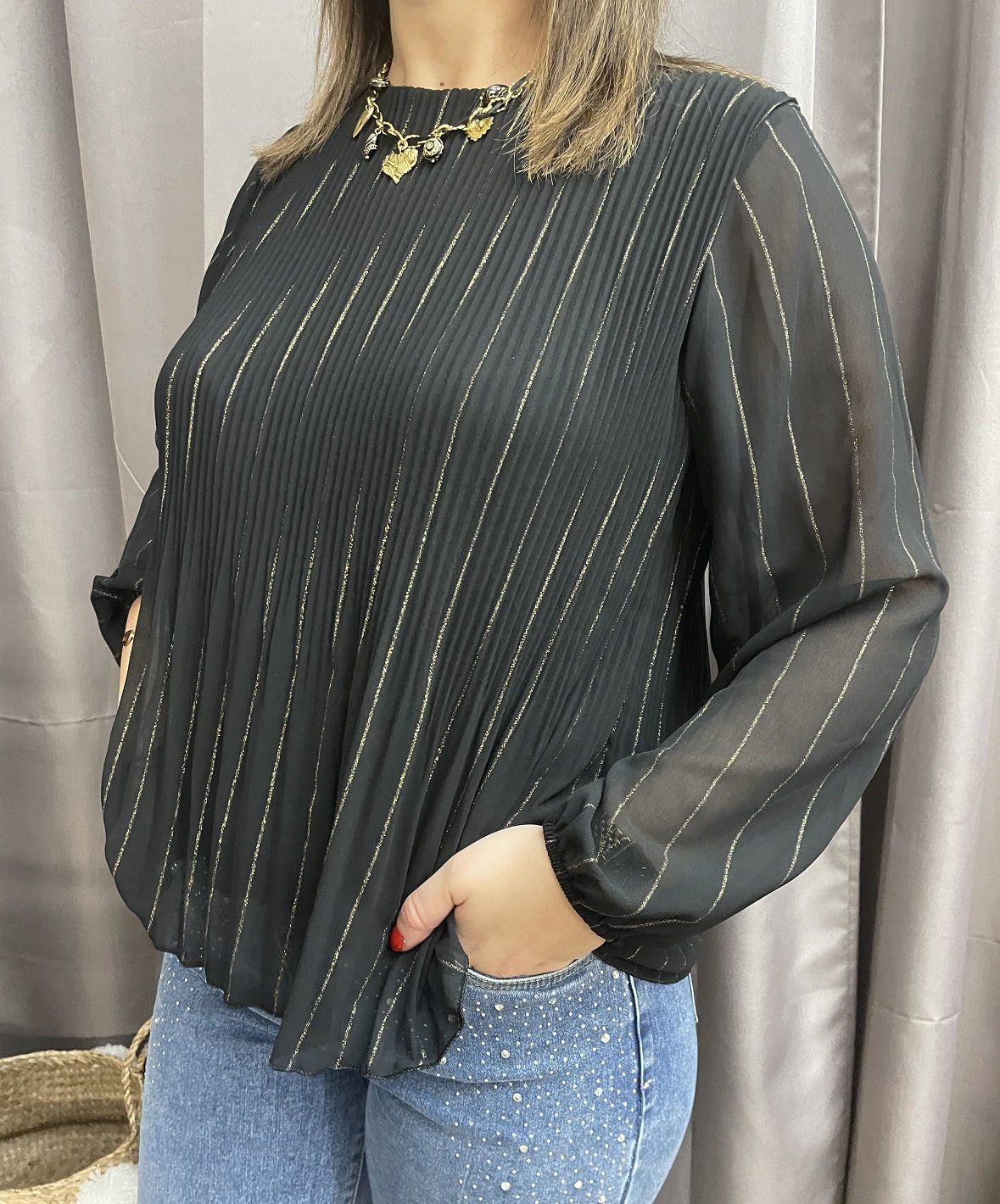 Blouse plissée à manches longues en transparence, doublée, col rond, noire, rayures dorées.