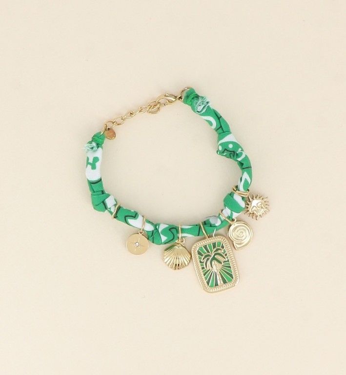 Breloques coquillage, soleil, plaquette palmier et émail.