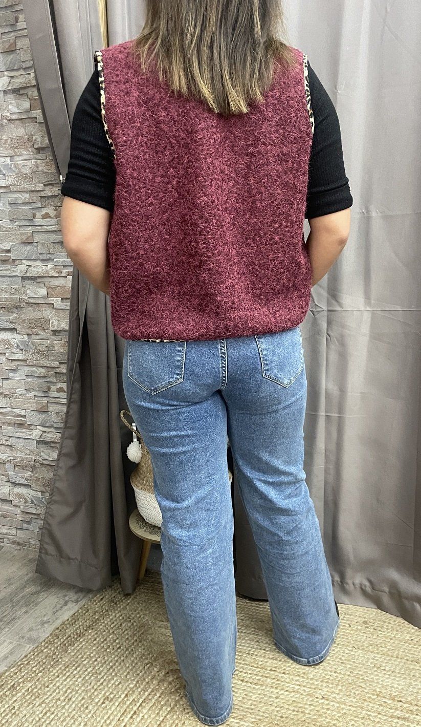 Gilet sans manches effet laine lisse chiné. Tout doux. Deux poches devant. Bordures léopard.