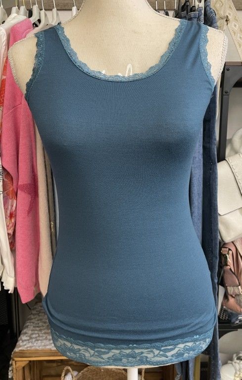 Haut avec de la dentelle au col, aux emmanchures et au bas.