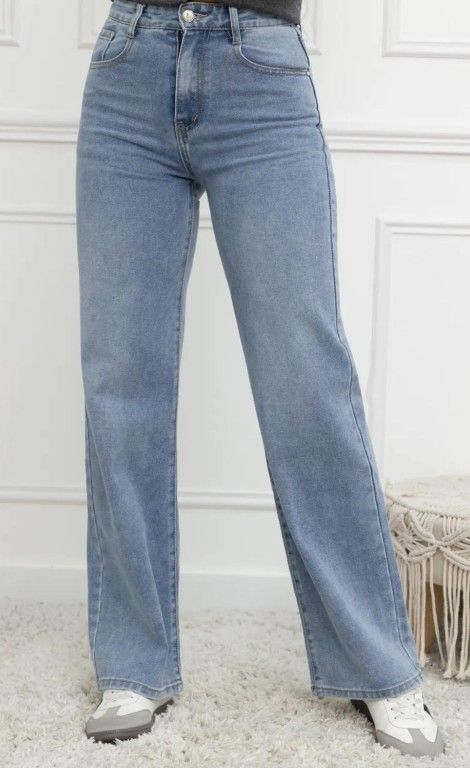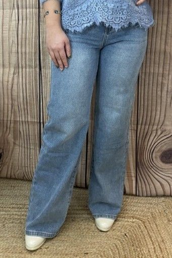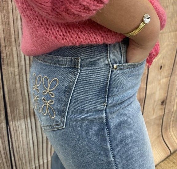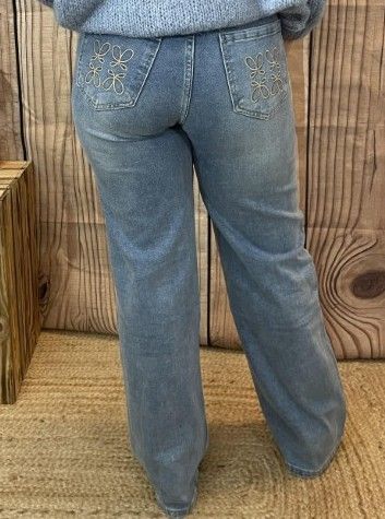 Jean bleu, deux poches devant, deux à l'arrière imprimées. Fermeture éclair et bouton.