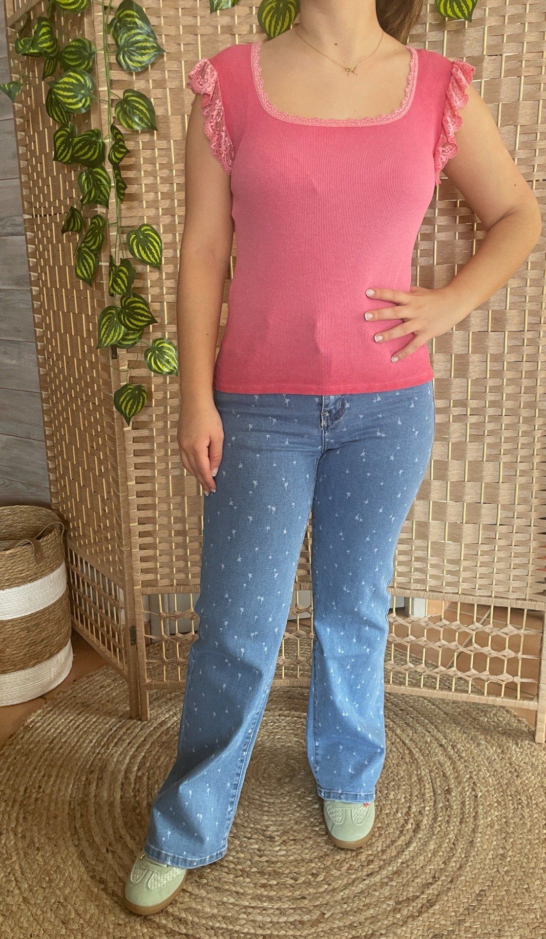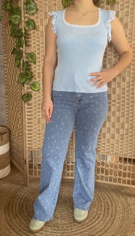 Jean bleu ciel wide leg avec impressions palmiers. Bouton et fermeture éclair.