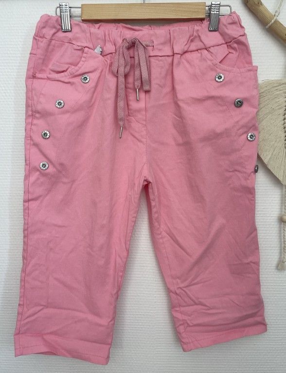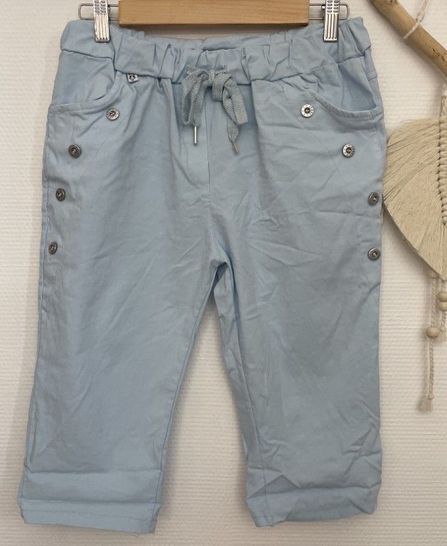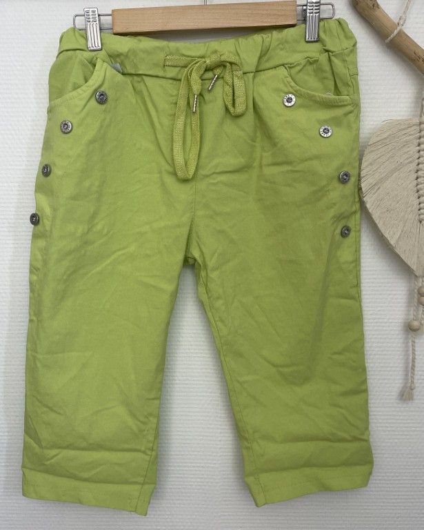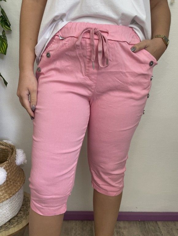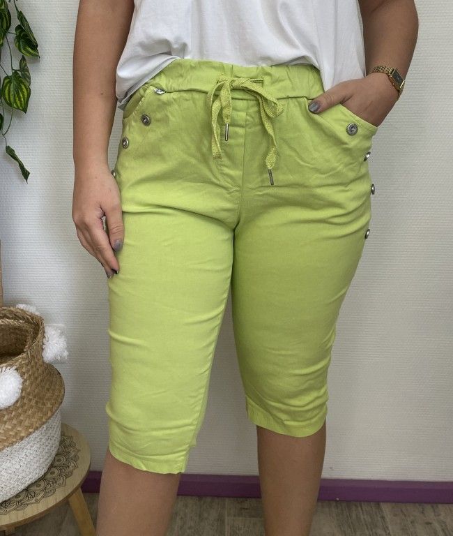 Pantacourt taille élastiquée, lien à nouer, 2 poches, boutons côtés.