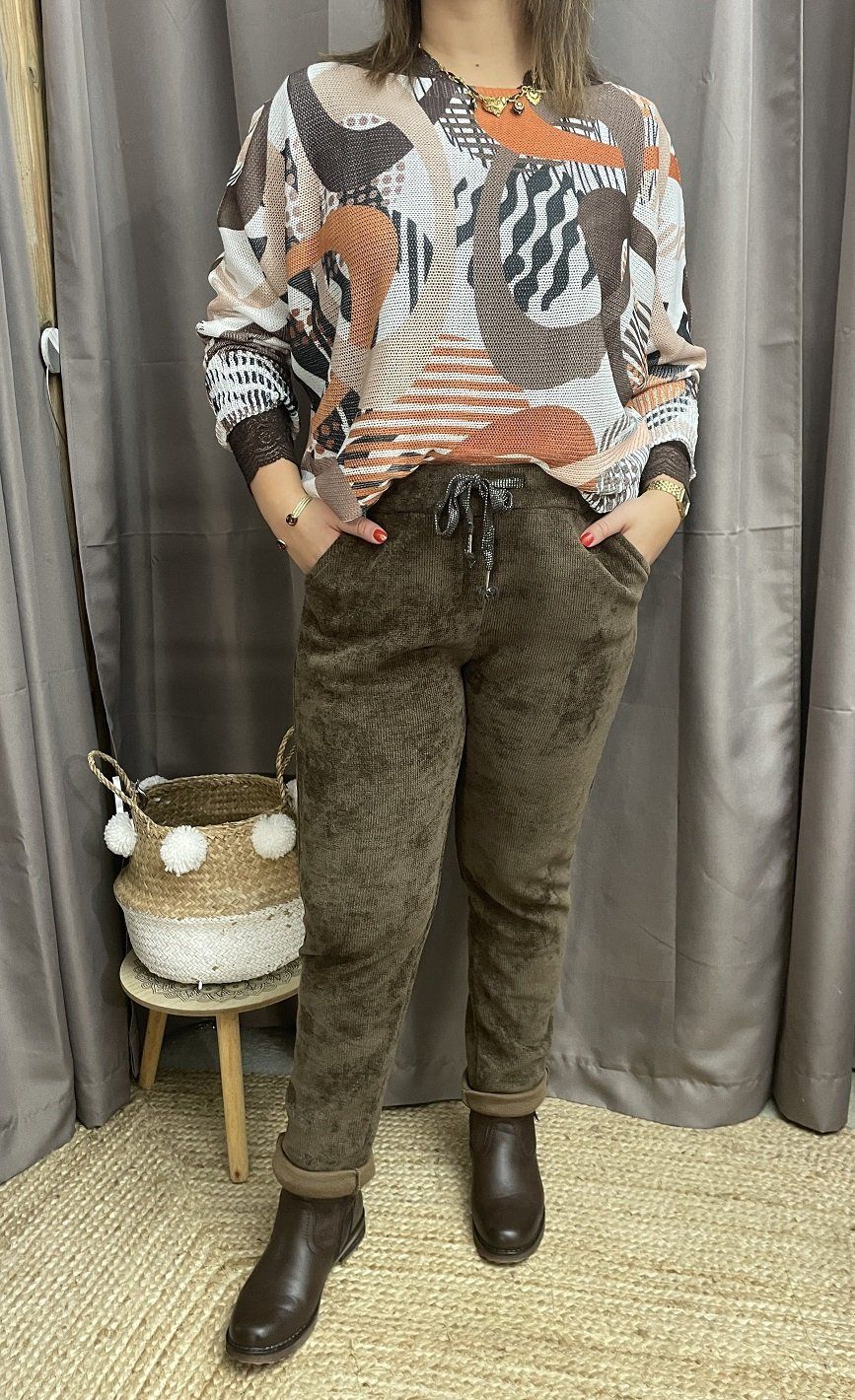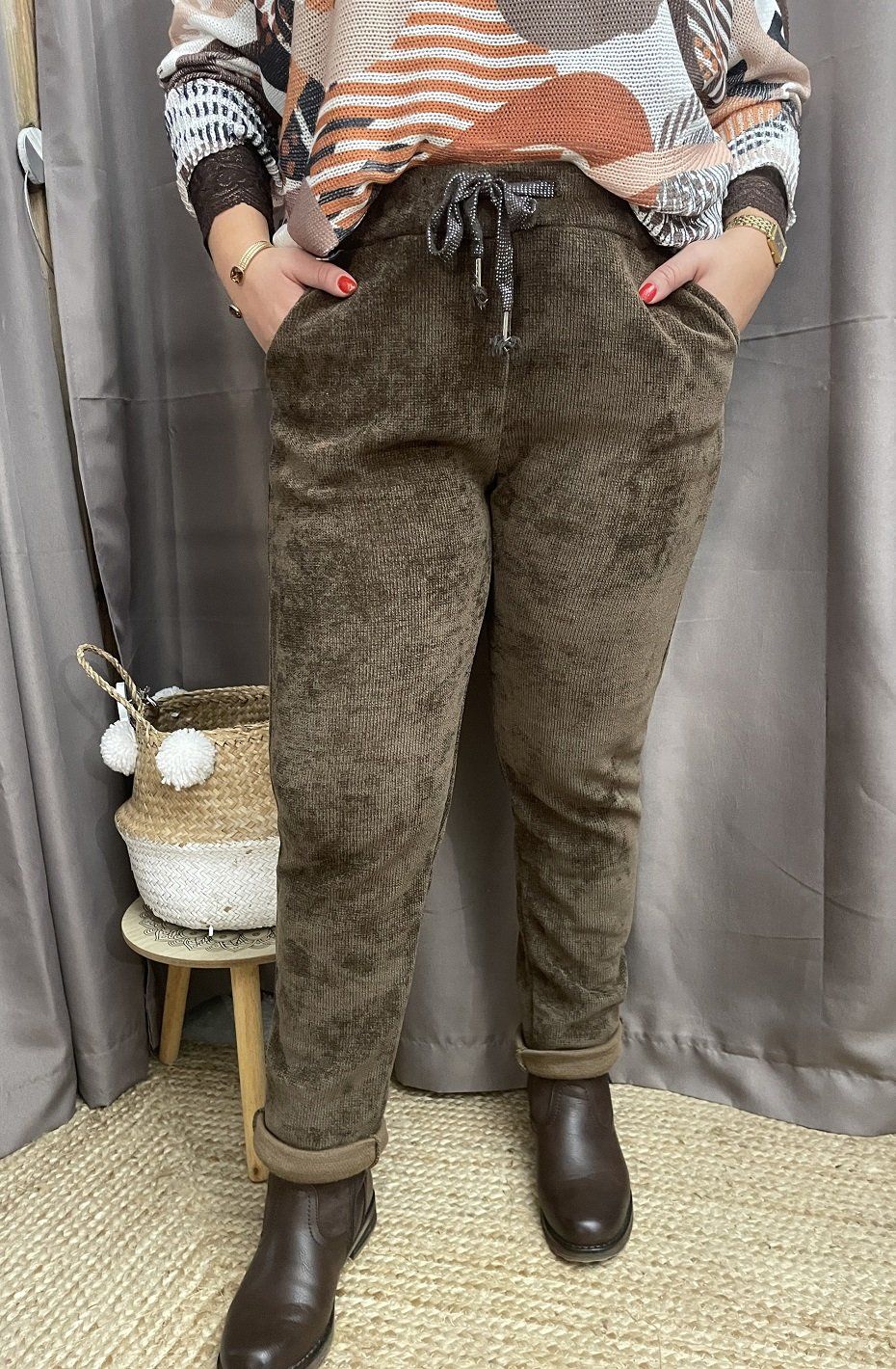 Superbe pantalon forme jogging, taille élastiquée avec lien à nouer, 2 poches côtés.