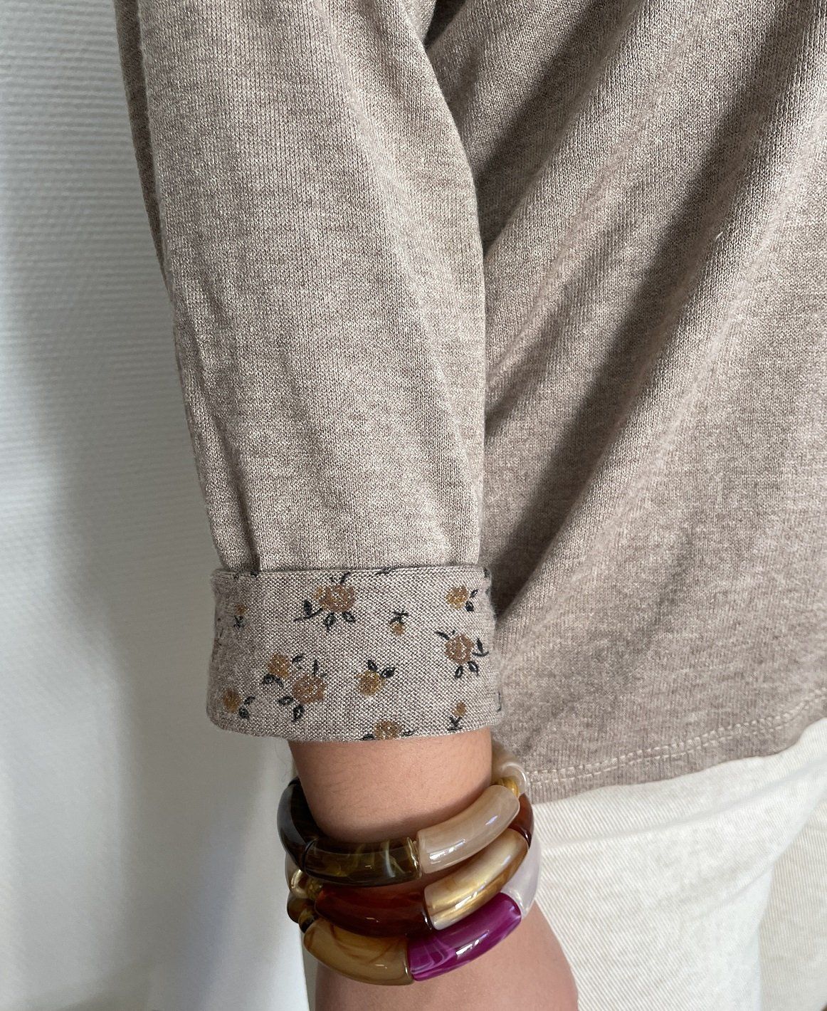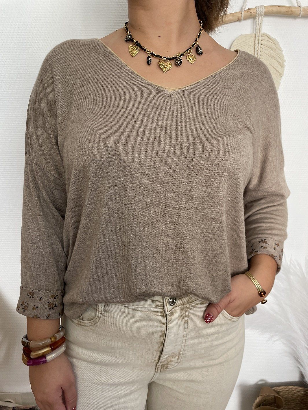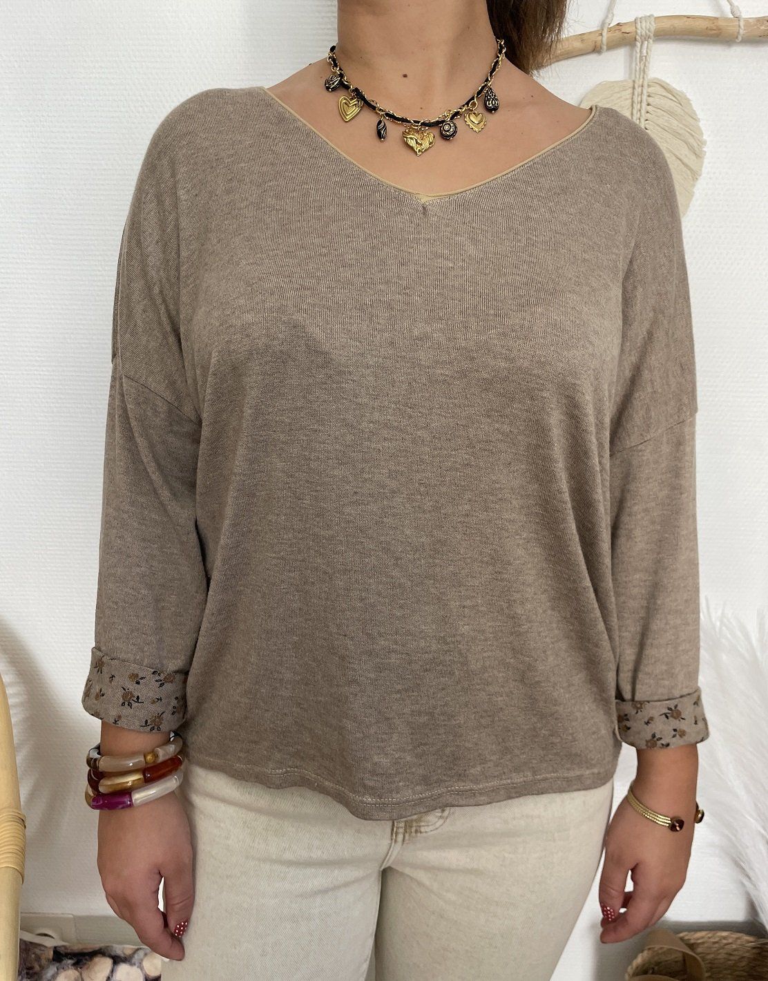 Pull col V à manches longues. Intérieur imprimé. Les manches peuvent se retourner et laisser apparaître l'imprimé.