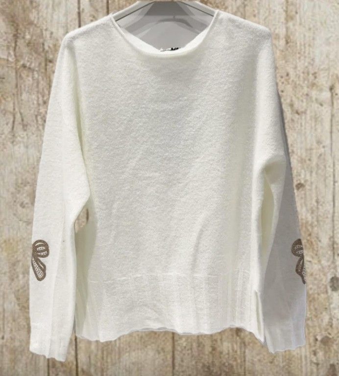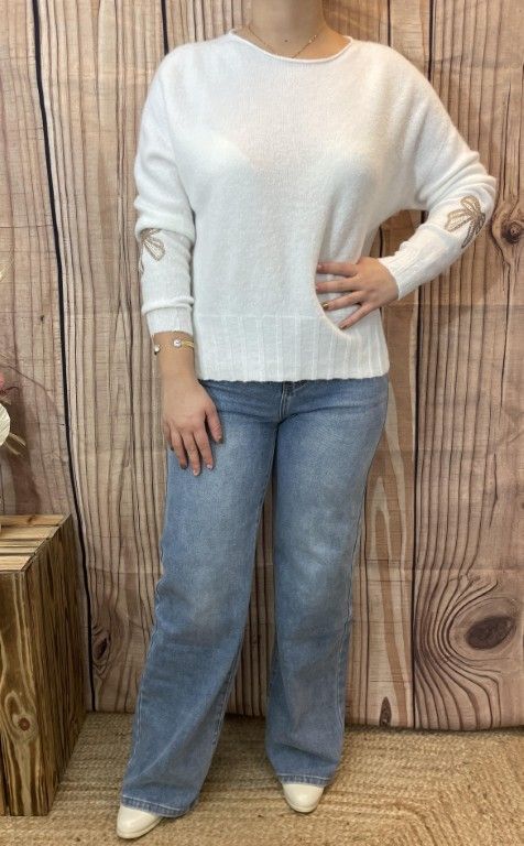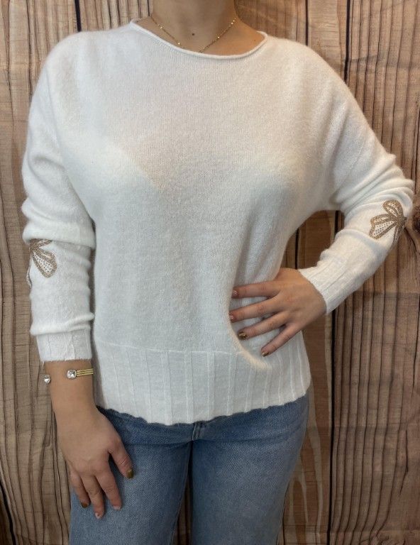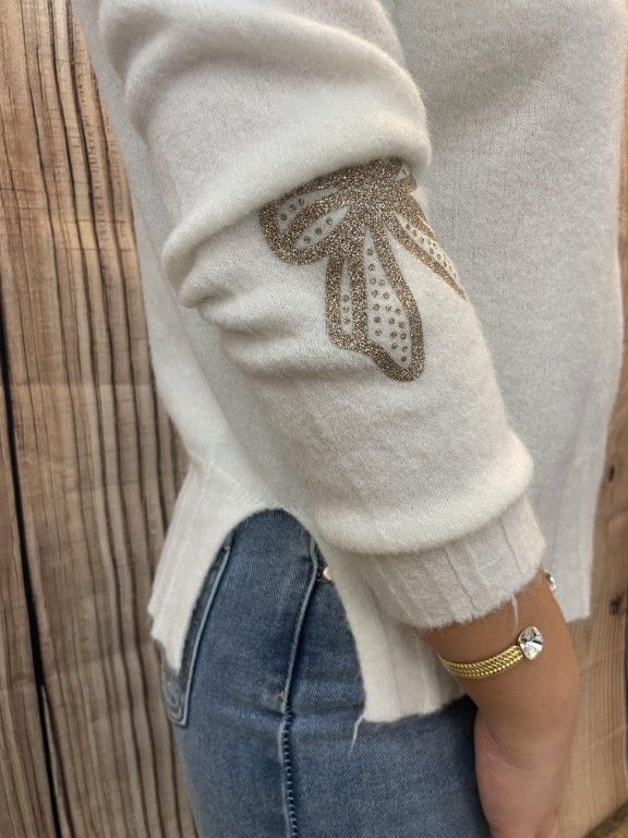Pull à manches longues, col rond. Impression noeuds dorés sur les coudes. Côtes aux poignets et au bas.