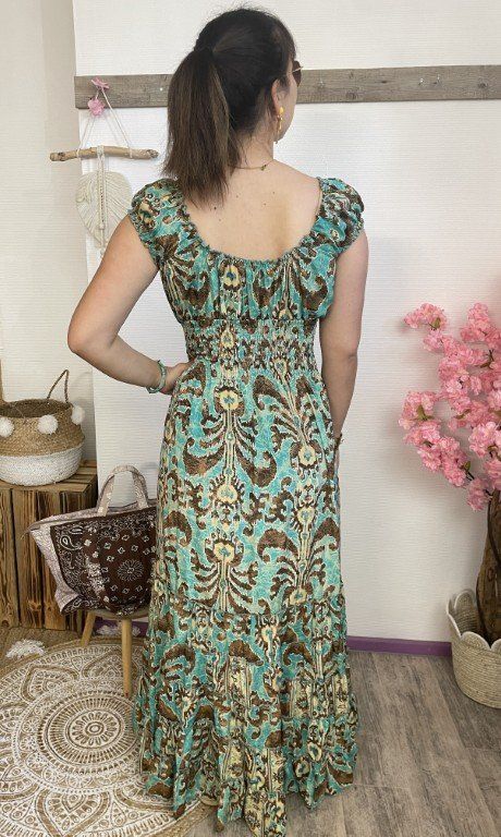 Robe longue à petites manches 100 % soie, col V. Froncée à la taille.