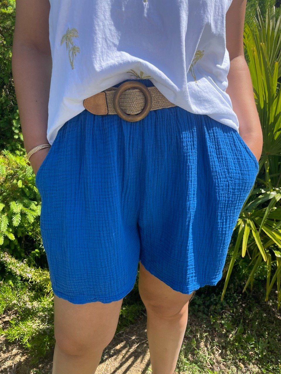 Short taille élastiquée avec ceinture amovible. Deux poches.