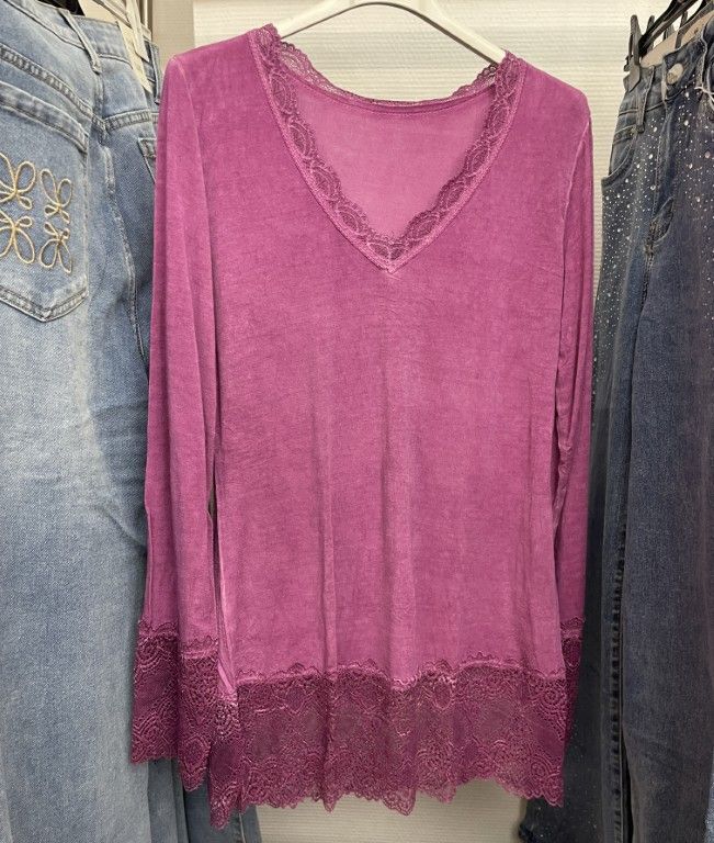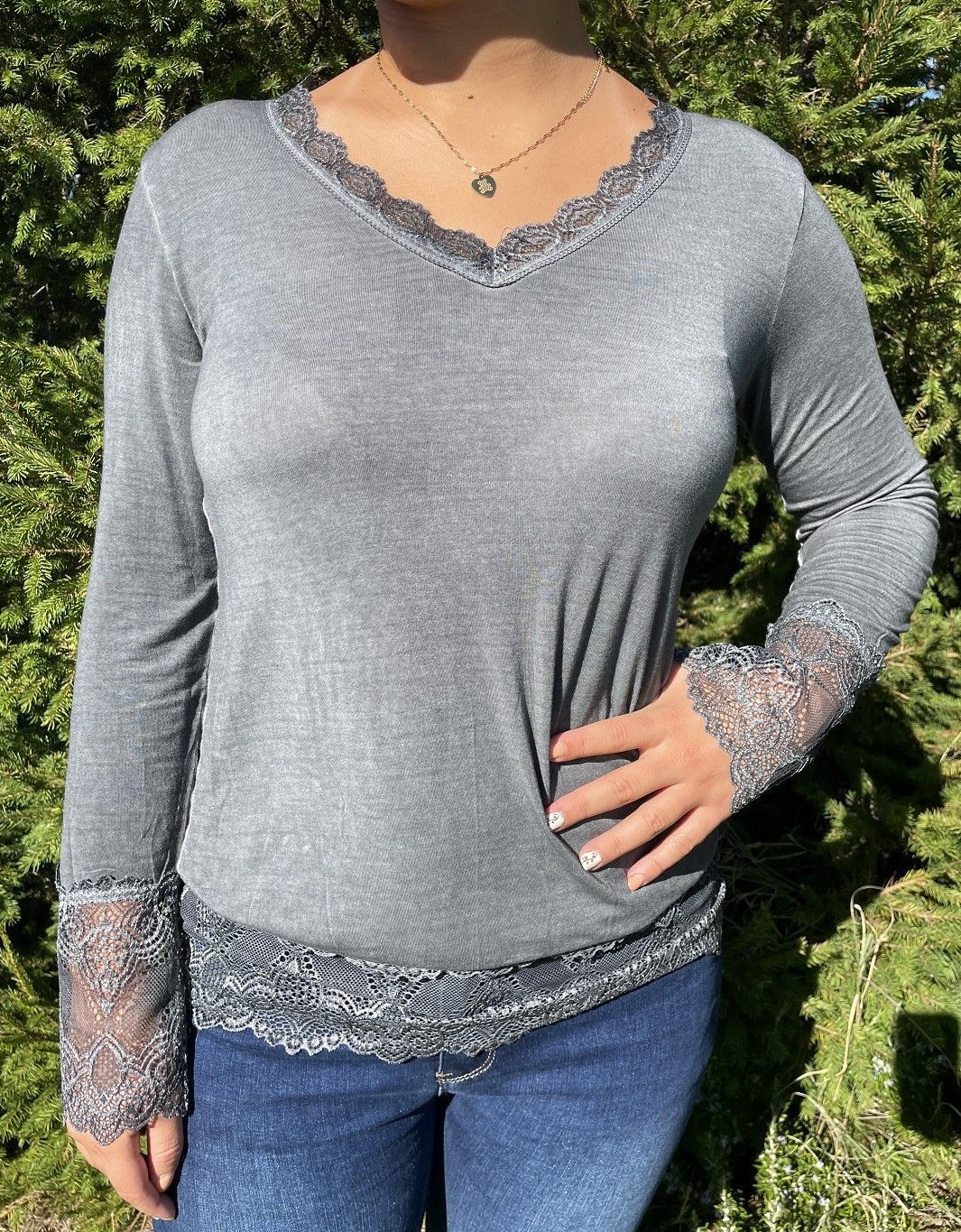 Sous-pull à manches longues avec dentelle aux poignets, au bas et au col V.