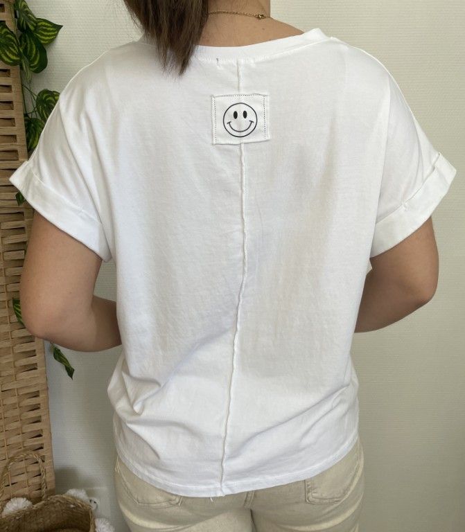 Petite impression smiley haut du dos. Le revers des manches est cousu.