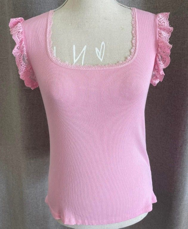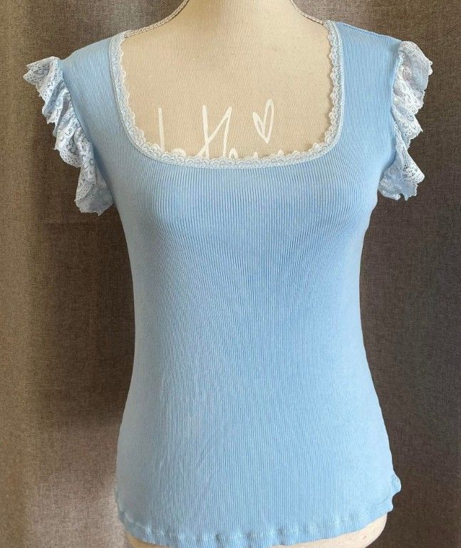 Joli tee-shirt à manches courtes avec des petits volants brodés. Effet délavé et côtelé.